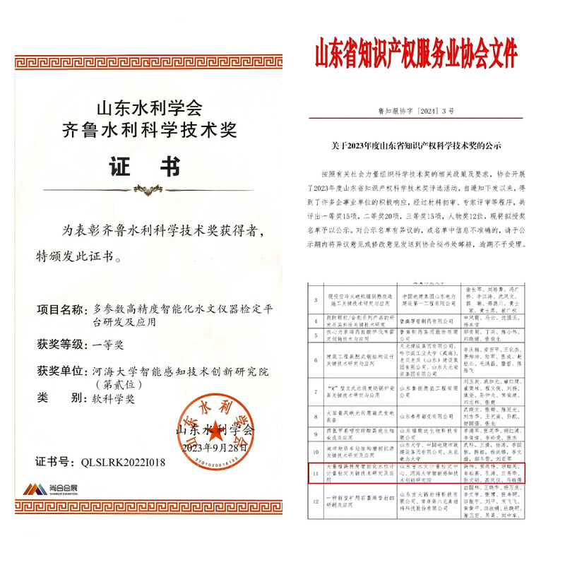 完成省级核心共性关键技术创新成果4项、市级核心共性关键技术创新成果3项;在技术突破上,创建多伺服电机联动系统,将流速检测范围从常规(0.01~5.0)m/s提升至(0.001~8.0)m/s,解决低速与高速水流测量难题;研发动水位自动追踪技术,将水位计检定分辨力从毫米级提高到0.1毫米级;研发气液混合型微纳米气泡自动散布装置,改善ADCP检测粒子均匀性与跟随性等;研究院科研成果屡获殊荣,“多参数高精度智能化水文仪器检定平台研发及应用”获山东水利学会齐鲁水利科学技术奖一等奖,“智能化流速计量检定平台研发及应用”获潍坊市科学技术进步奖三等奖,“大量程高精度智能化水位计计量检定关键技术研究及应用”获省知识产权科学技术奖一等奖,“一种智能化高精度流速检定装置设计研究”获山东省水文科学技术奖优秀论文二等奖;并联合多家单位申报并推进水利部重大科技项目,持续为行业技术标准提升与科技进步贡献力量。